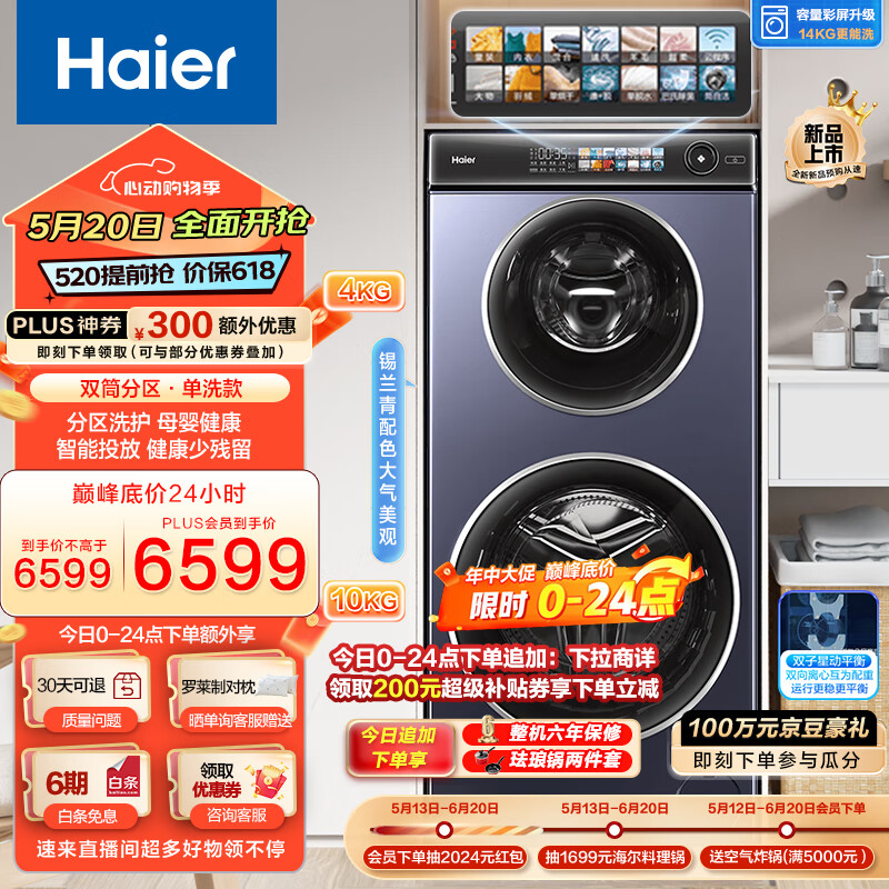 海尔(Haier)滚筒洗衣机全自动 家用双子双筒分区 4+10公斤超大容量【XQGF140-B1268U1】儿童母婴内衣 以旧换新价格:7099.00元!