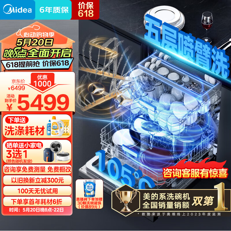 美的(Midea)16套嵌入式洗碗机 GX1000Pro 升级105℃热风烘干 五臂飓风洗 双驱变频 四星消毒 一级水效 独立式价格:9999.00元!