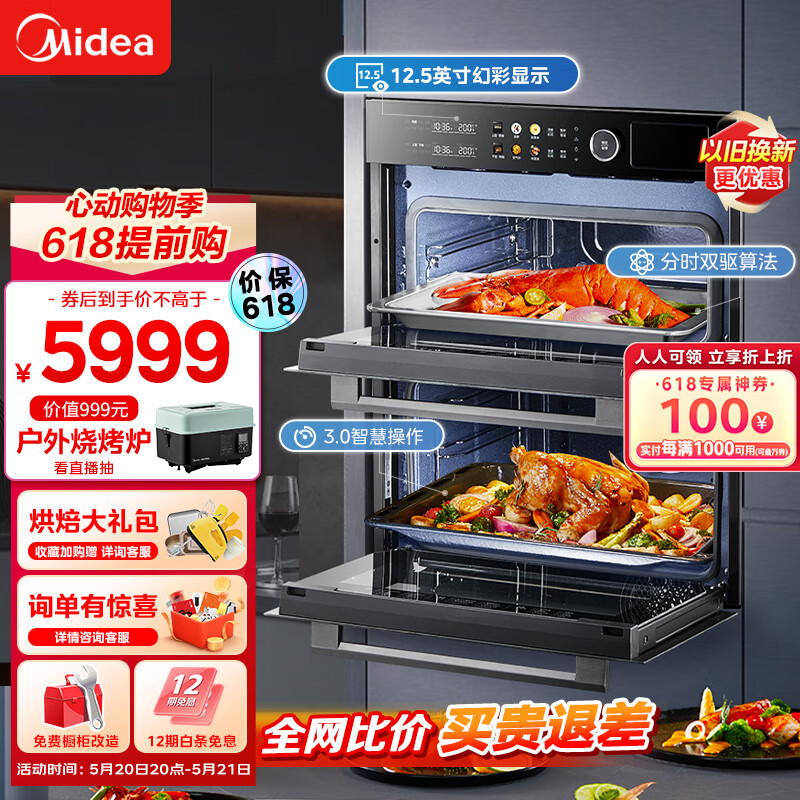 美的(Midea)85L大容量 12.5英寸幻彩大屏 免费厨房改造 嵌入式蒸烤箱二合一双腔家用烘焙蒸箱烤箱SD85价格:6599.00元!