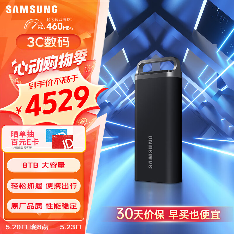 三星(SAMSUNG)8TB Type-c USB 3.2 移动固态硬盘(PSSD)T5 EVO 星耀黑 多设备兼容性能稳定价格:4529.00元!