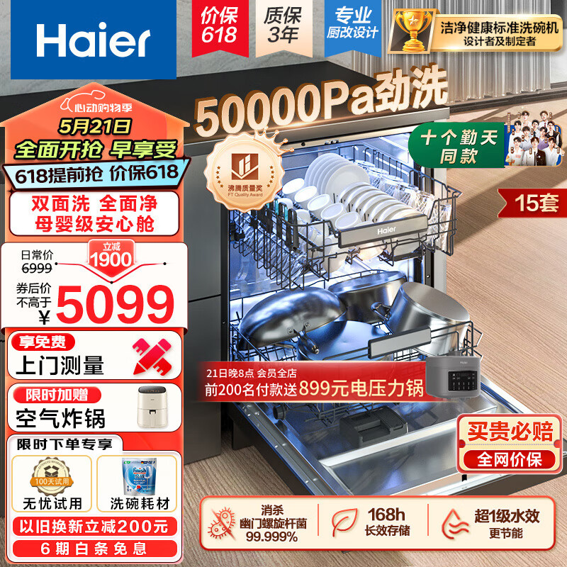 海尔(Haier)15套嵌入式双面洗健康洗碗机W5000 变频高压双一级水效 三重洁净 智能开门速干EYBW152266BKU1价格:5599.00元!