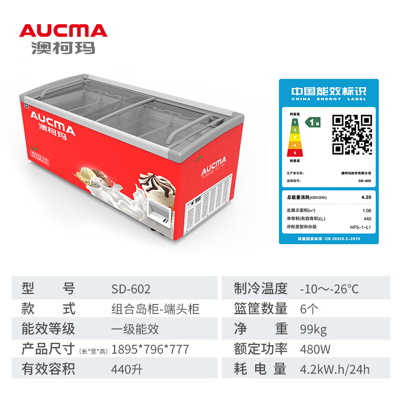 澳柯玛(AUCMA)602升组合岛柜 弧形玻璃门卧式冷柜 全冷冻低温商用展示柜 大容量雪糕柜 左右推拉 SD-602价格:3499.00元!