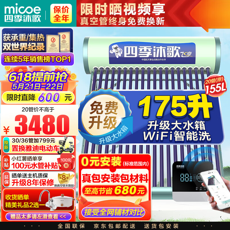 四季沐歌(MICOE)飞享WIFI智控太阳能热水器 家用光电两用 自动上水 带电加热 6分独立双管口 20管155L送货+安装价格:4080.00元!