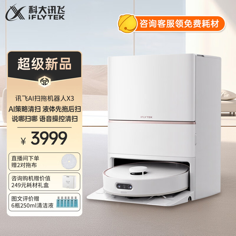 科大讯飞(iFLYTEK)AI扫拖机器人X3 AI策略清扫 说哪扫哪 扫地机器人扫拖一体自动清洗全自动 自动集尘 自清洁 月光白价格:3999.00元!
