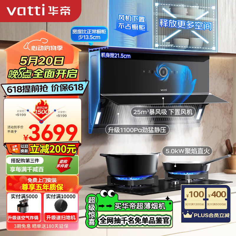 华帝(VATTI)【小魔盒】抽油烟机超薄近吸顶侧家用变频双吸大吸力25风量自清洗排油烟机燃气灶具套装C16天然气价格:4599.00元!
