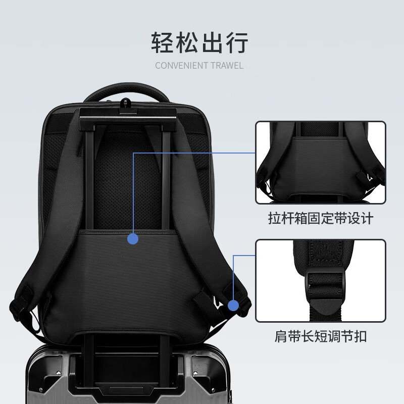 3、颜值很高,尤其蓝色的这款,时尚中带着稳重???空间也很大,后面的电脑仓很窄,适合放电脑后再放一些A4文件之类的东西,包裹行很好。前面空间很大,可以放一些衣物洗漱用品和一些杂物。总体来说很满意,重量也很轻,背起来一点也不累
