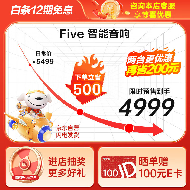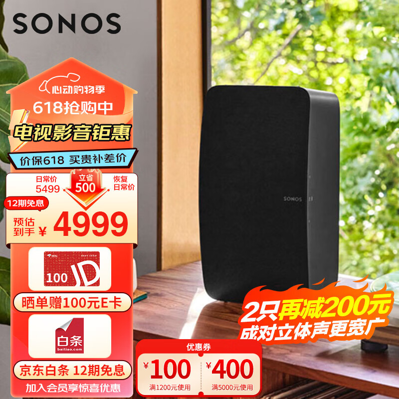 SonOS Five 有源音箱 WiFi无线 HiFi音响 高保真 可直连唱机 家庭影院 环绕可组合 家用书架客厅桌面 黑价格:4999.00元!