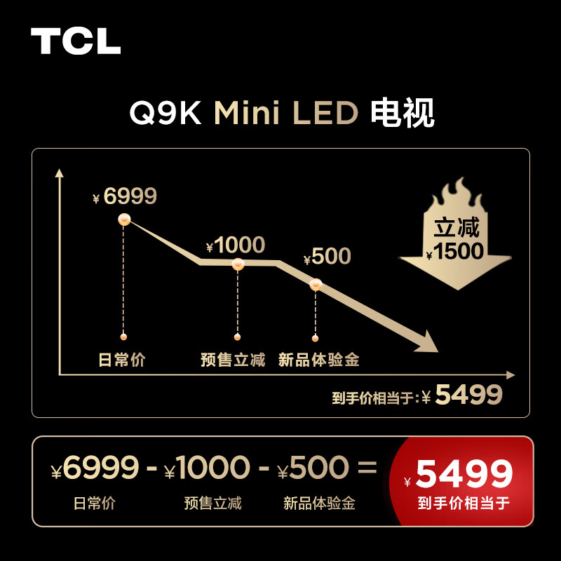 TCL电视 65Q9K 65英寸 Mini LED 1008分区 XDR 2400nits QLED量子点 超薄 4K大屏 液晶智能平板电视机价格:6999.00元!