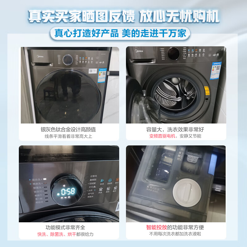 3、双十一买的,用起来很方便,比实体店更加优惠。我家一直用的美的的洗衣机,之前这台都用了十几年,也没出现过问题,所以这次果断出手,还是选择美的。
