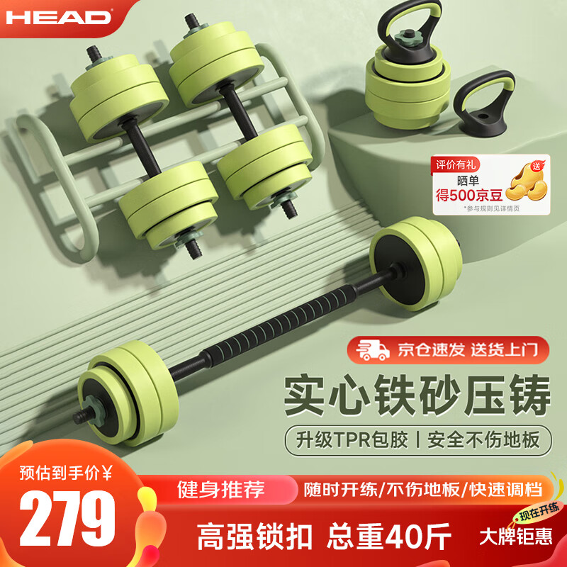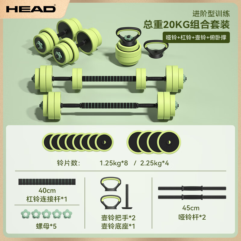 HEAD海德哑铃男多功能杠铃组合套装壶铃可调节可拆卸包胶哑铃20kg价格:265.10元!