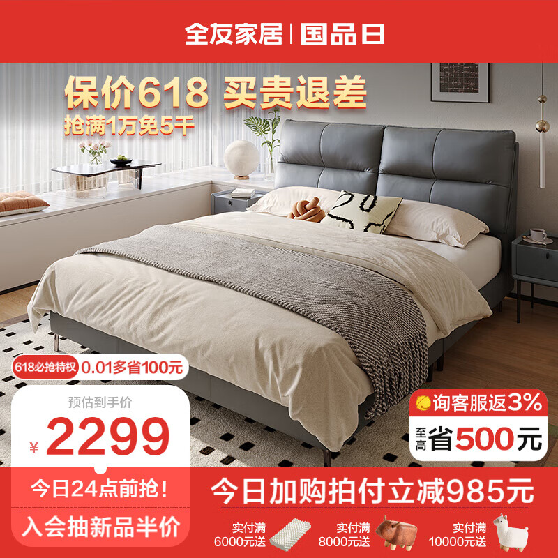 全友家居 头层牛皮现代简约真皮艺软包床1.5x2米主卧室双人大床116019价格:3284.29元!