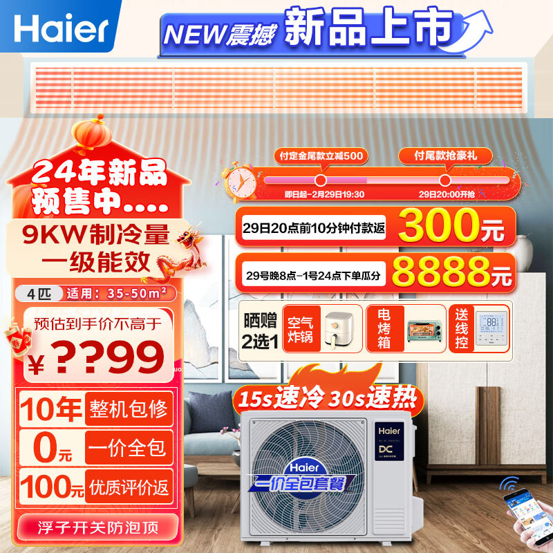 海尔(Haier)中央空调 风管机一拖一 4匹嵌入式空调 4p云璟Plus全直流变频 冷暖一级能效 KFRd-90NW/76EG81U1价格:8499.00元!