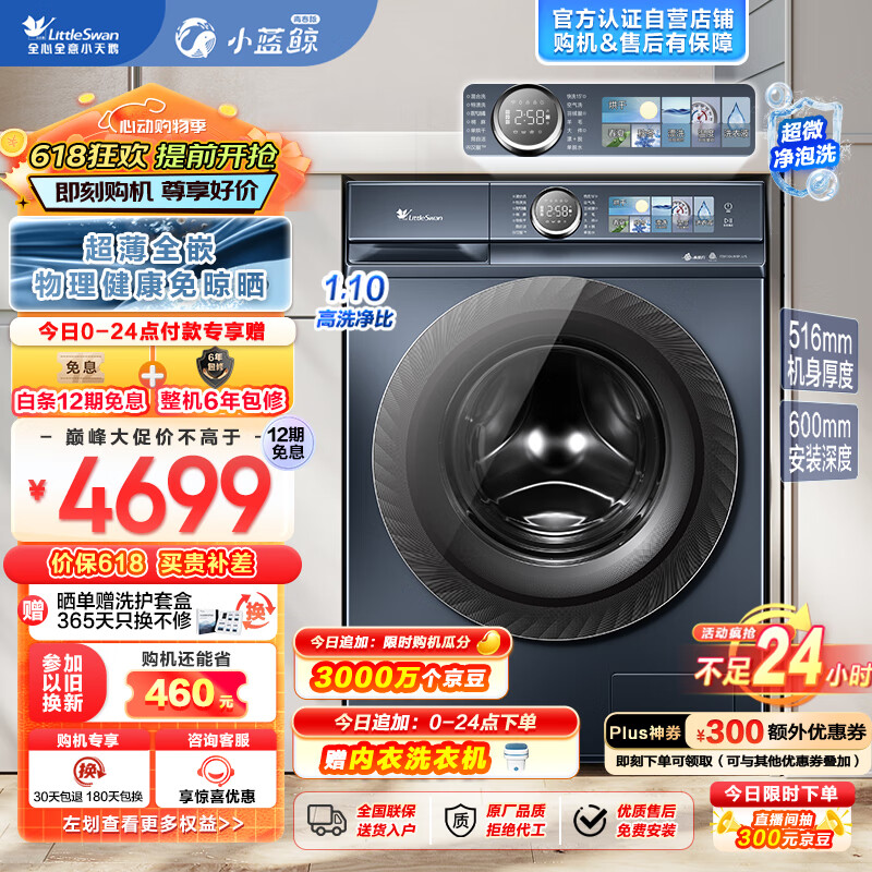 小天鹅(LittleSwan)滚筒洗衣机全自动【小蓝鲸青春版TD100V86PLUS】洗烘一体机 超薄全嵌 超微净泡洗 水魔方 10公斤价格:4699.00元!