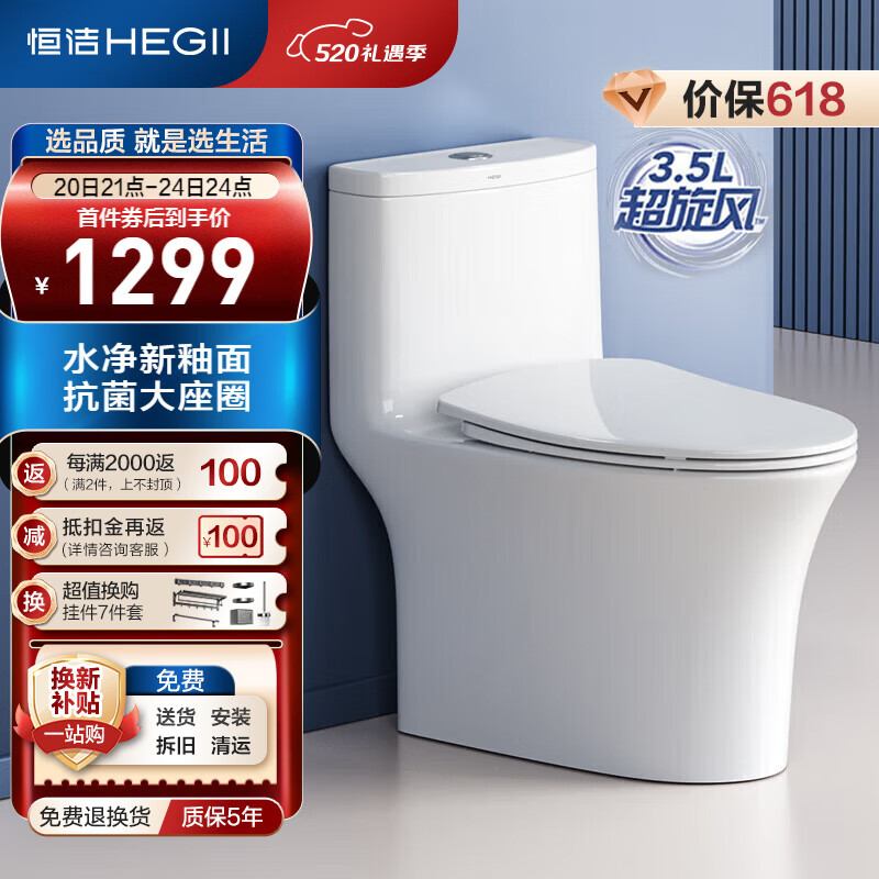 恒洁(HEGII)马桶562 超旋风大冲力抗菌座圈虹吸式家用坐便器HC0562DT-400价格:1659.00元!