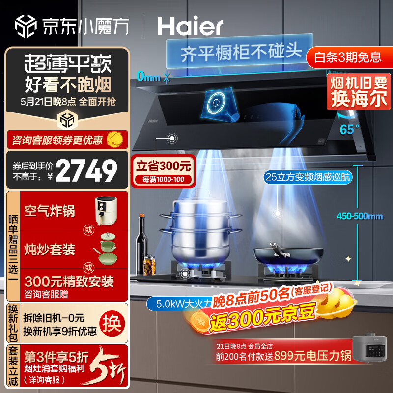 海尔(Haier)抽油烟机 超薄近吸烟灶套装 25m3/min变频有效风顶侧双吸外观 厨房吸油烟机燃气灶具C21U1+Q2BE2天价格:3049.00元!