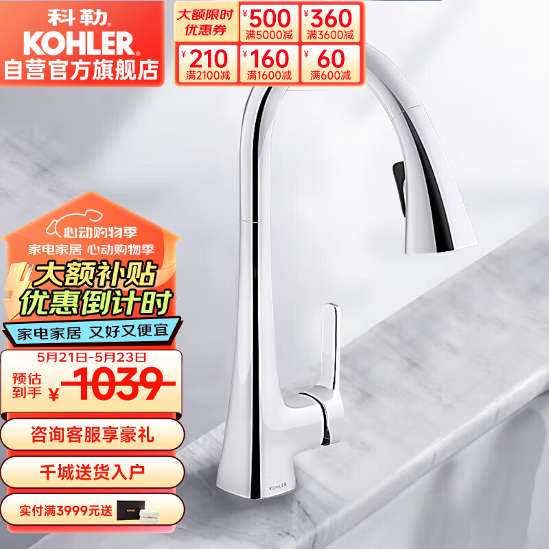 科勒(KOHLER)厨房水槽龙头抽拉式冷热水洗菜盆龙头旋转式龙头22867T 抽拉龙头价格:1299.00元!