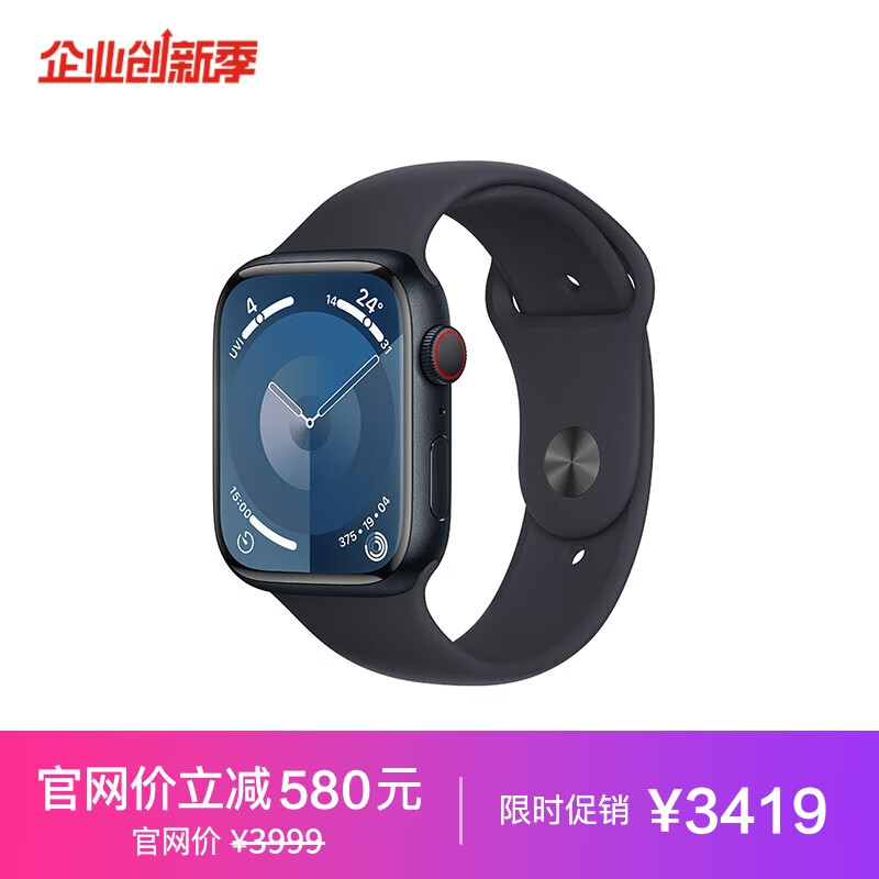 Apple Watch Series?9(GPS+蜂窝网络);45?毫米午夜色铝金属表壳;午夜色运动型表带-M/L MRP63CH/A*企业专享价格:3419.00元!