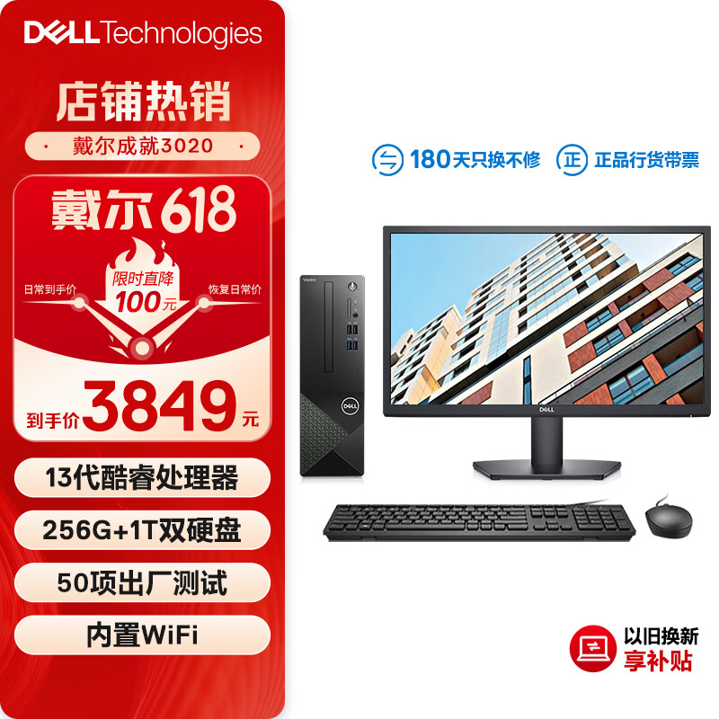 戴尔(Dell)成就3020 台式电脑主机(酷睿13代i5-13400 8G 256GSSD+1TB)21.5英寸显示器 高性能CPU价格:3849.00元!