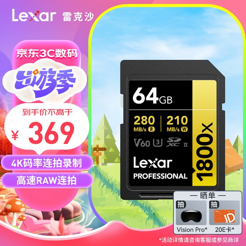 雷克沙(Lexar)64GB SD存储卡 C10 U3 V60 数码相机高速内存卡 读280MB/s 写210MB/s 4K畅拍(1800x)价格:369.00元!