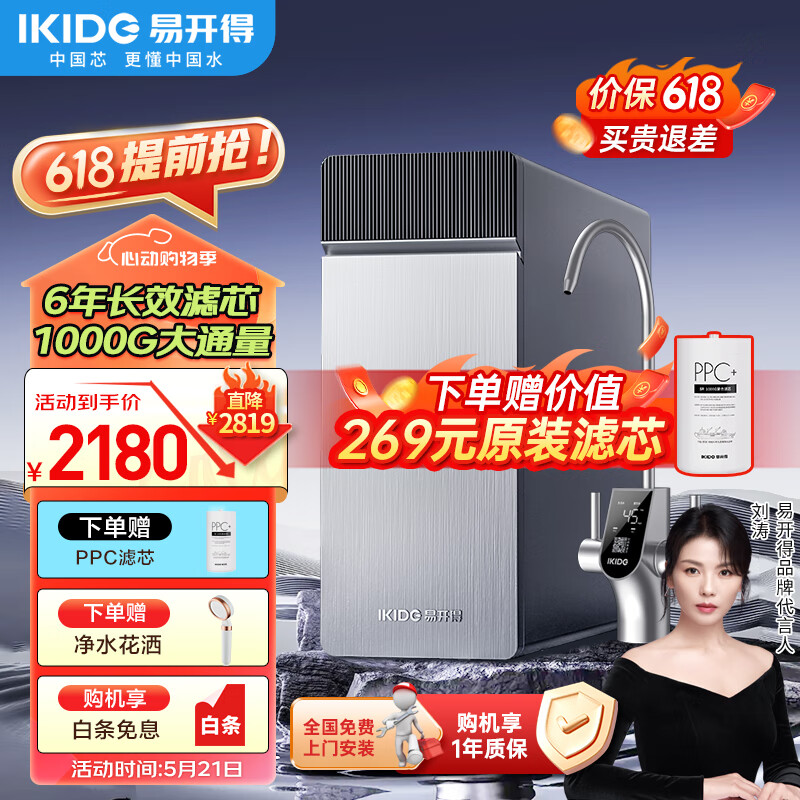 易开得银龙净水器家用厨房1000G大通量6年RO反渗透厨下式净水机自来水饮水直饮一体水龙头过滤器2.6L/分价格:2180.00元!