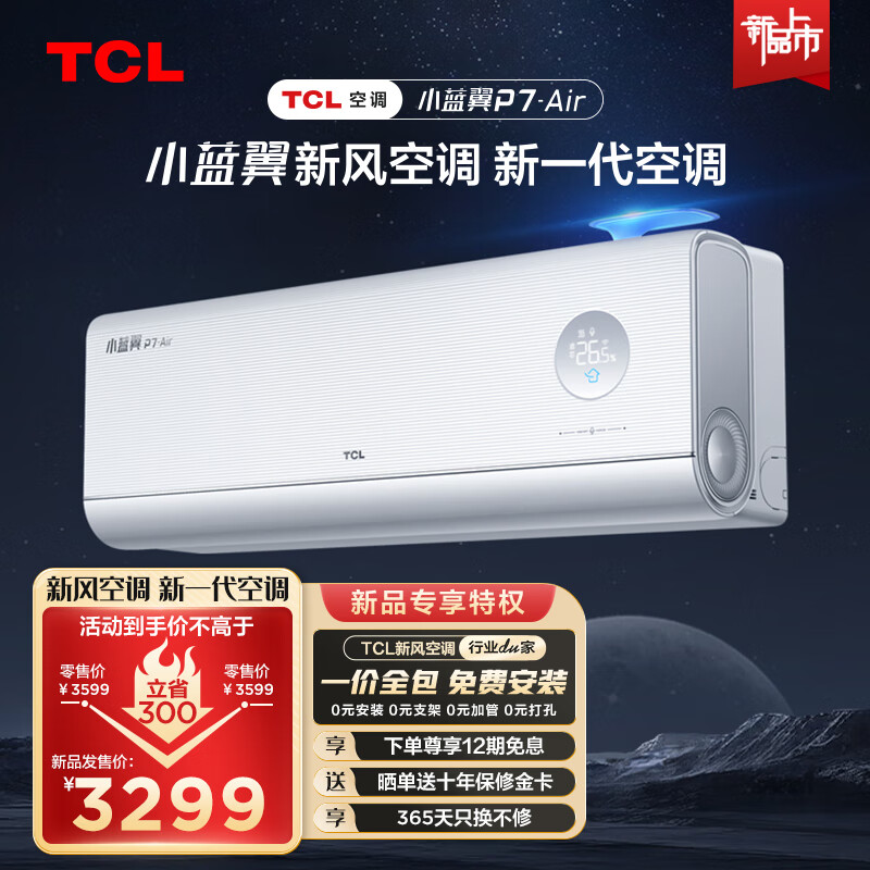 TCL新风空调1.5匹新一级变频冷暖语音30?/h大新风量小蓝翼P7挂式空调挂机KFR-35GW/YP7Cb+B1一价全包价格:3299.00元!