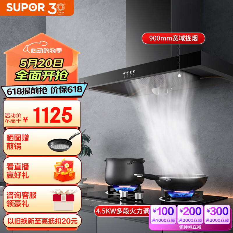 苏泊尔(SUPOR)排油烟机 宽域拢烟大吸力油烟机 家用易清洁欧式顶吸抽油烟机 吸油烟机燃气灶套装DT10+DB19天然气价格:1125.00元!
