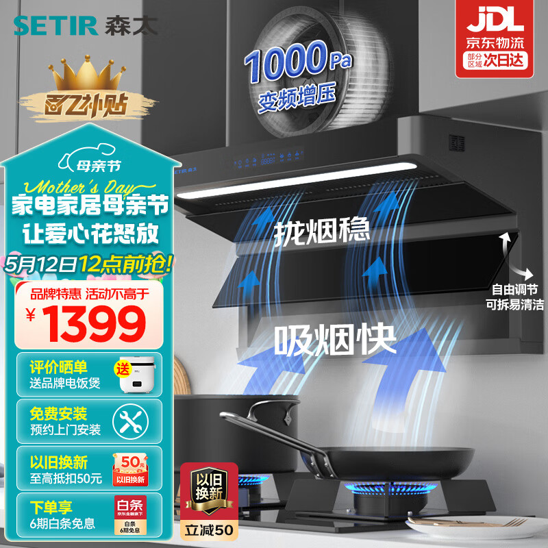 森太(SETIR)抽油烟机 顶侧双吸直流变频7字型油烟机1000Pa增压家用吸油烟机 【挥手控制+烟感监测】B813BQL 【28立方智能变频】价格:1399.00元!
