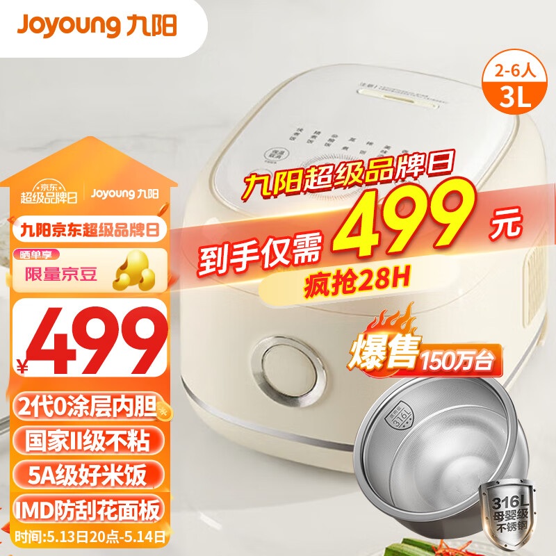 九阳(Joyoung)【2代0涂层】3L2-6人家用多功能电饭煲电饭锅316L不锈钢内胆点阵微坑水润膜无涂层5A认证3升30N1S价格:549.00元!