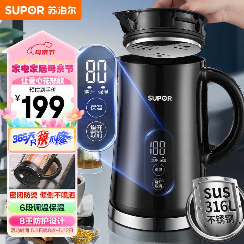 苏泊尔(SUPOR)电水壶烧水壶家用316L不锈钢电热水壶智能温度显示8重防护设计 【倾倒防烫伤】SW-15FQ03A价格:199.00元!