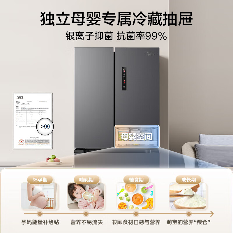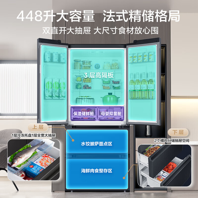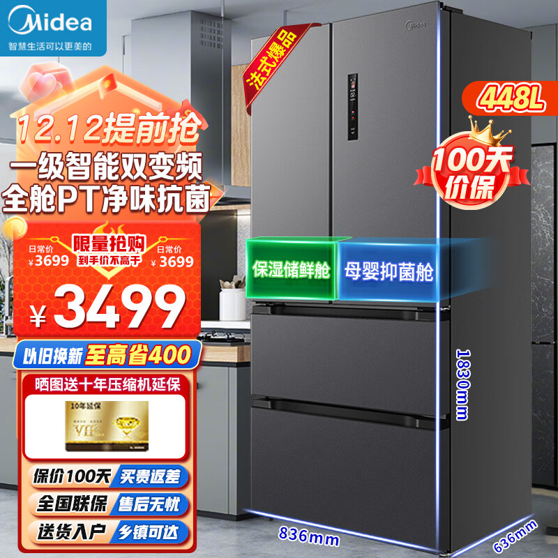 美的(Midea)448升法式四开门多门电冰箱大容量一级能变频超薄母婴风冷无霜家用智能MR-470WFPZE-炭灰-月夜价格:3499.00元!