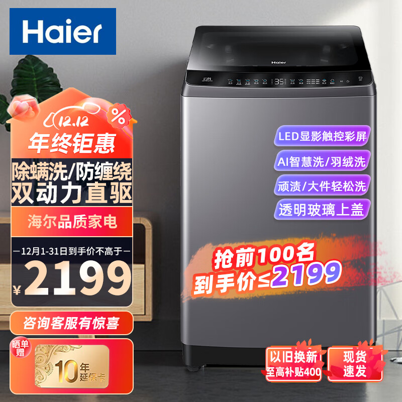 海尔(Haier)10公斤全自动波轮洗衣机双动力直驱变频防缠绕大容量智能预约除螨羊毛羽绒洗XQS100-BZ3288价格:2199.00元!
