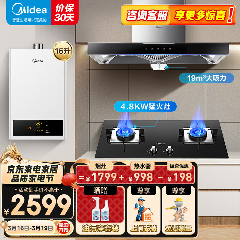 美的(Midea)欧式顶吸抽油烟机灶具烟灶多件套装燃气热水器家用烟灶燃热厨房三件套T33A+Q217B+16HWF天然气价格:2599.00元!