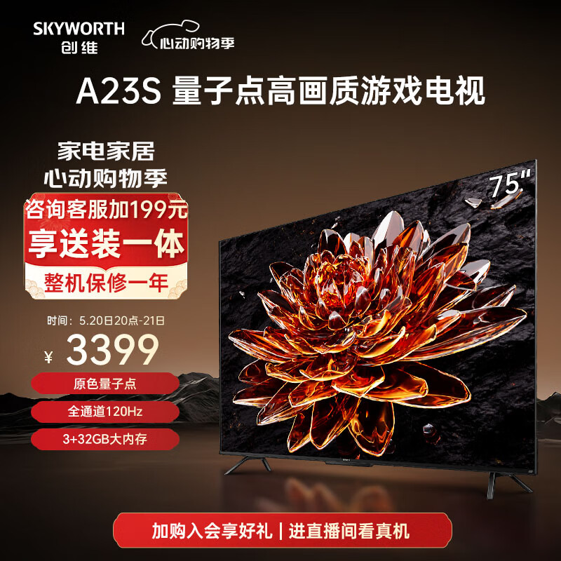 创维电视75A23S 75英寸电视机量子点120Hz高刷3+32G蓝牙5.0双频WIFI 4K超高清声控屏游戏电视价格:3499.00元!
