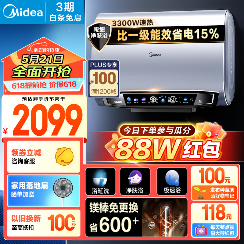 美的(Midea)60升玲珑超薄双胆扁桶电热水器3300W变频 镁棒免换12倍增容一级能效F6032-UD(HE)京东小家价格:2299.00元!