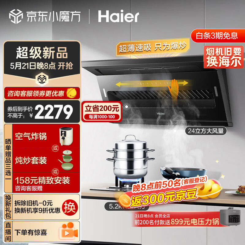 海尔(Haier)抽油烟机 顶侧双吸烟灶套装 24m3/min大吸力 挥手智控 家用厨房吸油烟机燃气灶具套装C51+Q2BE3天价格:2479.00元!