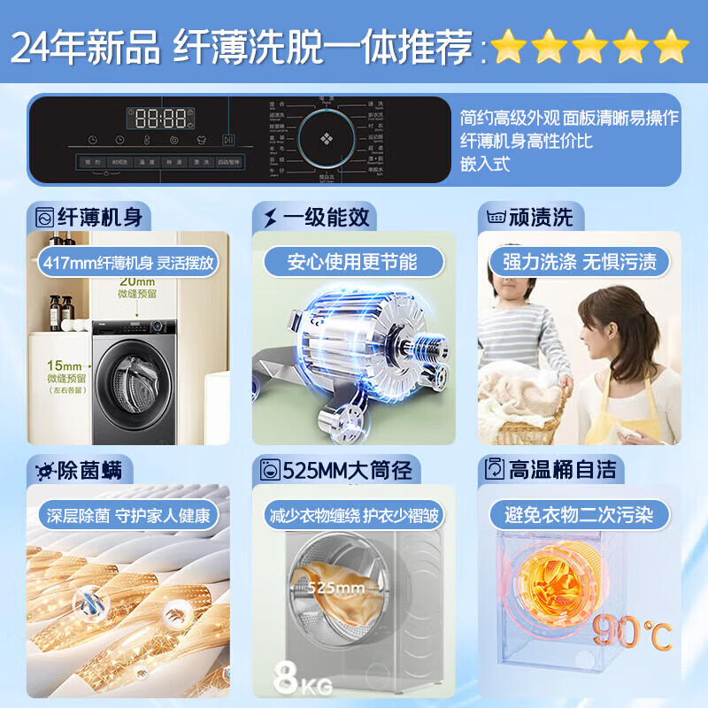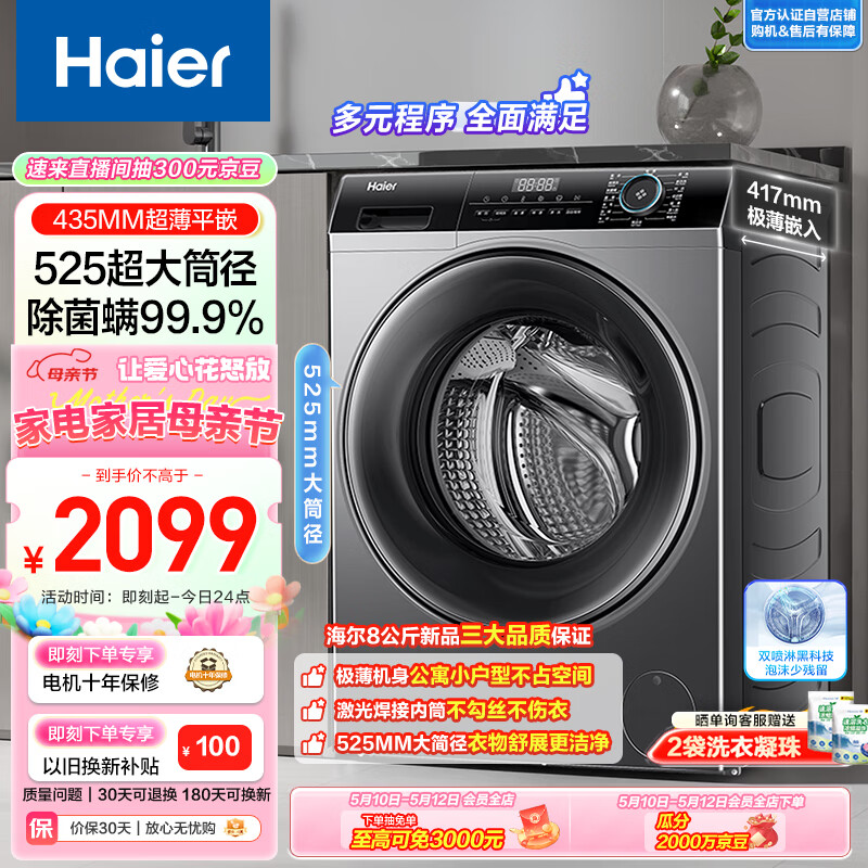 海尔(Haier)滚筒洗衣机全自动 8公斤大容量 417mm超薄平嵌【EG80MATE33S】 525大筒径 家用 以旧换新价格:2099.00元!