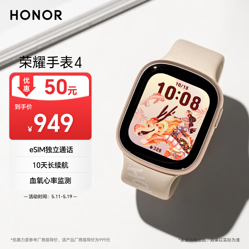 荣耀手表4 晨辉金 eSIM独立通话 10天长续航 全智能手表 男女运动手表 血氧心率监测 龙年表盘新年礼物价格:949.00元!