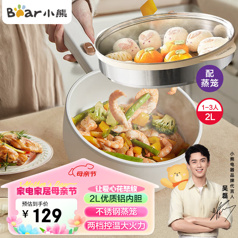 小熊(Bear)电炒锅 电煮锅 电火锅小电锅宿舍小锅 2L不粘锅 电蒸锅 多功能锅电热锅料理锅 DRG-D20Y6丨不锈钢蒸笼价格:129.00元!