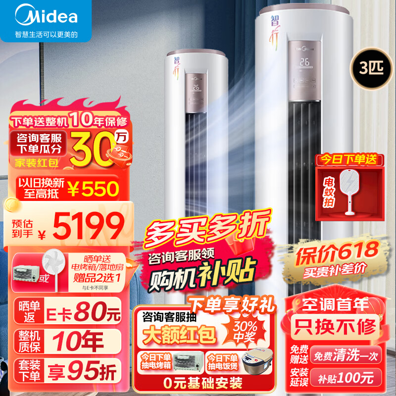 美的(Midea)空调柜机智行立式空调3匹以旧换新三级能效变频空调客厅空调冷暖空调 KFR-72LW/BDN8Y-YA400(3)A价格:5199.00元!