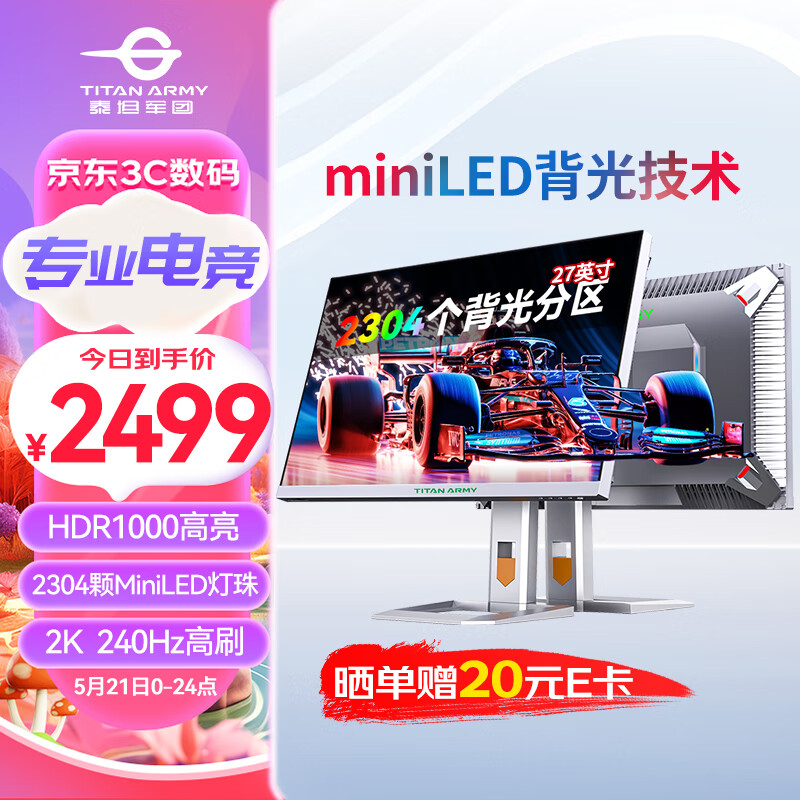 泰坦军团27英寸 miniLED 2K240Hz HDR1000 FAST IPS Type-C 90W 升降旋转 内置音箱电竞电脑显示器P27A6S价格:3499.00元!
