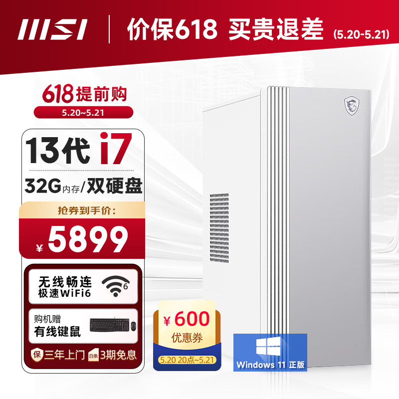 微星 设计师P60办公台式电脑(13代i7-13700F 32G 1TSSD+2T 4G独显 WiFi6)商用全套diy组装整机单主机价格:6499.00元!
