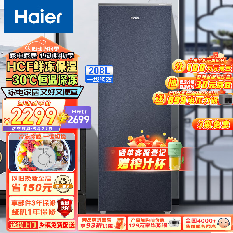 海尔(Haier)国瓷系列208升风冷家用立式冷藏冷冻柜抽屉式冷柜小冰柜家用小冰箱BD-208WGHB9D以旧换新价格:2499.00元!