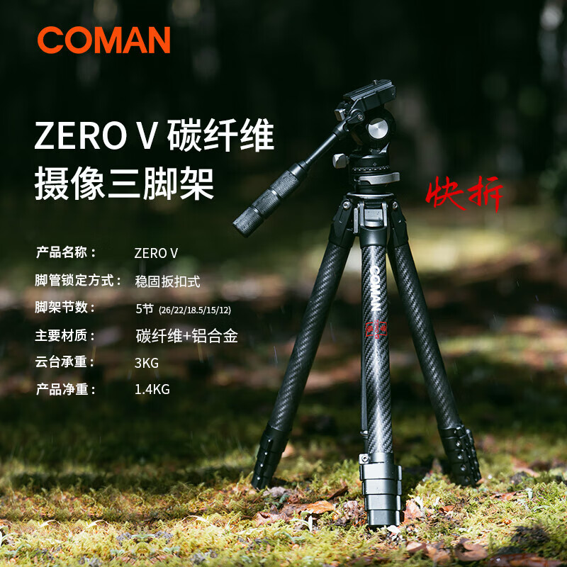 科漫(COMAN)ZERO V摄像快拆液压云台三脚架碳纤维轻量化佳能索尼摄影摄像便携旅行相机支架送DJV快装板+大力夹价格:1698.00元!