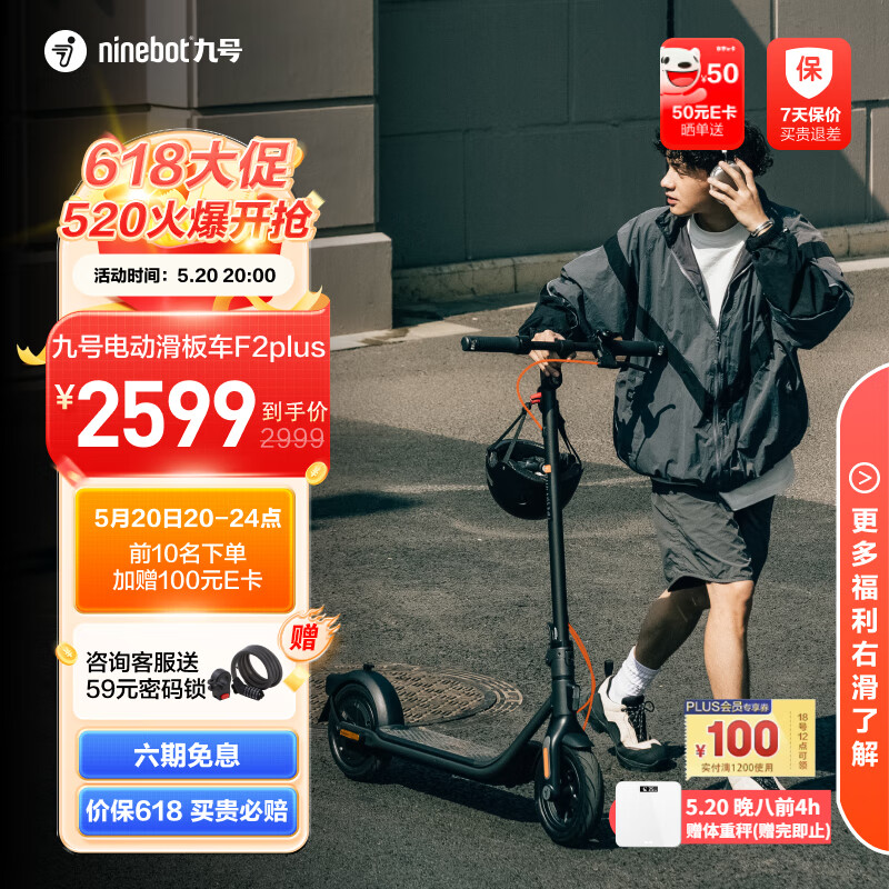Ninebot 九号电动滑板车成人F2Plus 便携可折叠智能九号电动车自修复胎55KM长续航(支持充气宝)价格:2598.00元!