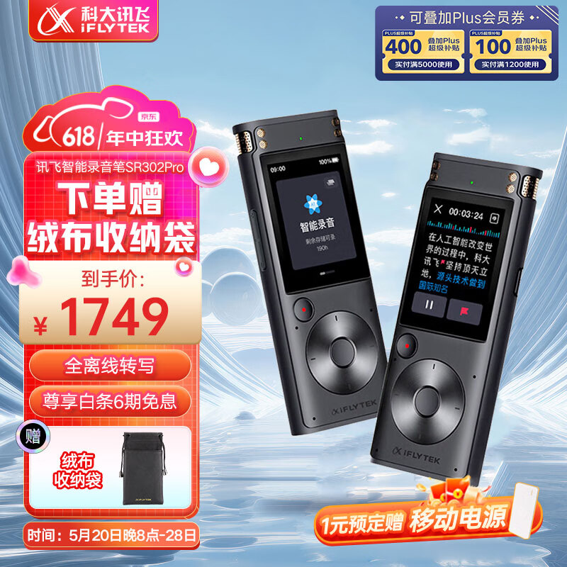 科大讯飞智能录音笔SR302Pro 32G内存 专业录音 高清降噪 离线实时转写 360°拾音 免费转写 星空灰价格:1749.00元!