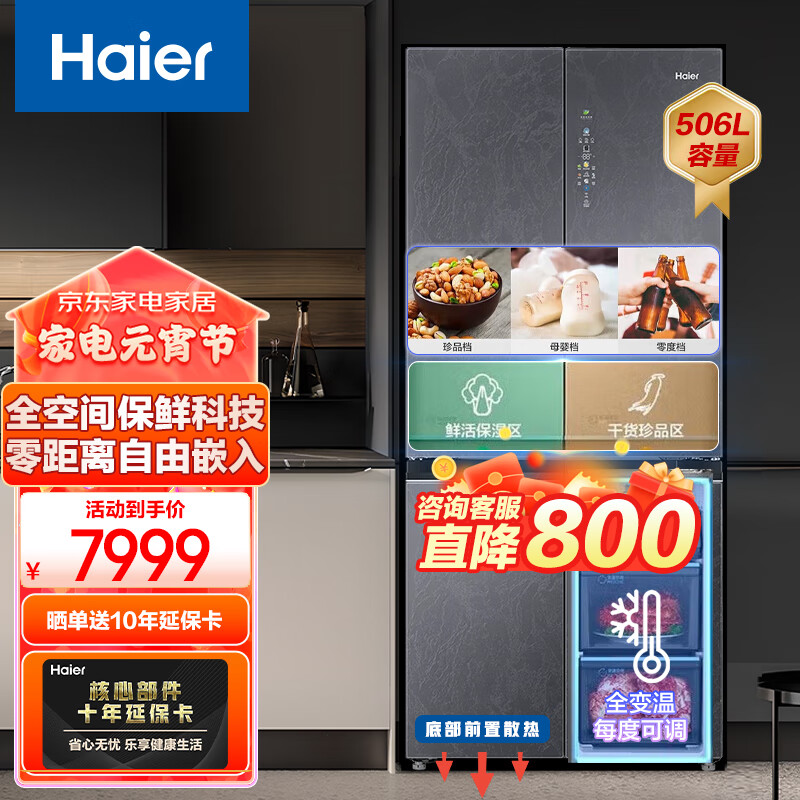海尔冰箱506升十字对开门冰箱风冷无霜变频 全空间保鲜 零距离自由嵌入 BCD-506WGHTD14S3U1[家电]价格:8599.00元!
