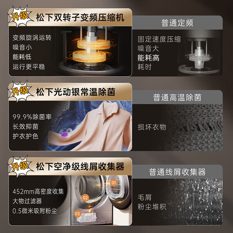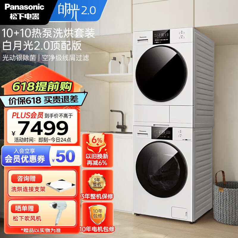 松下(Panasonic)白月光2.0顶配版洗烘套装 双变频热泵烘干洗衣机10+10公斤光动银除菌除螨泡沫净 NVAE+EH1015价格:8499.00元!