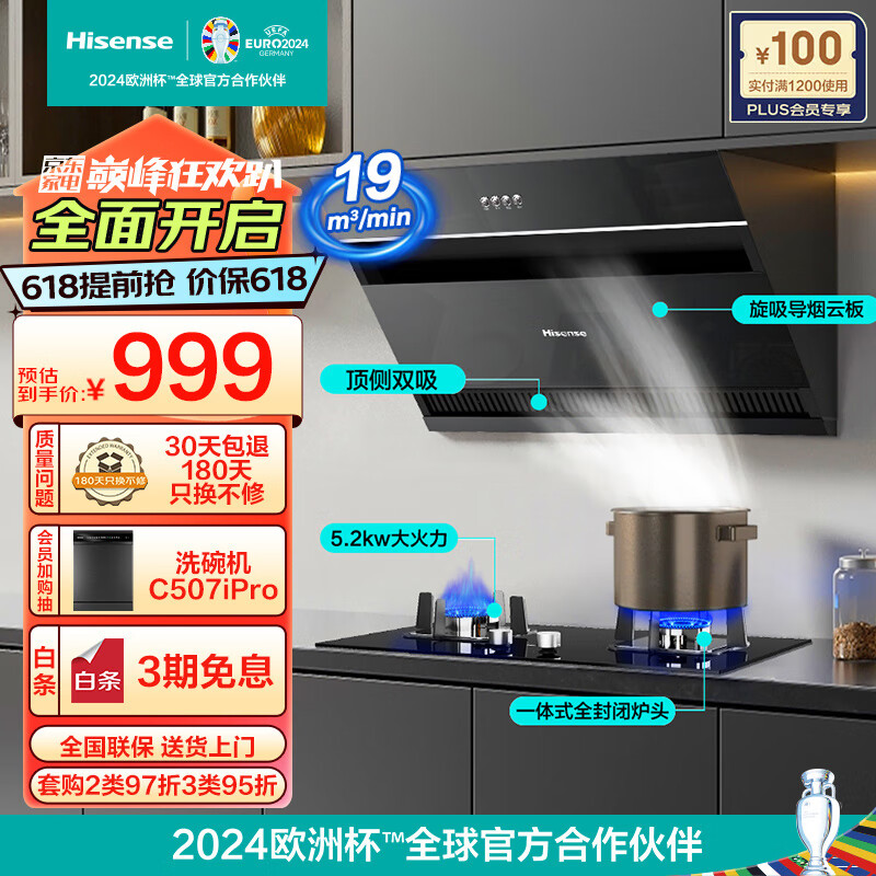 海信(Hisense)油烟机 抽油烟机 侧吸式燃气灶5.2kW灶具 厨卫烟灶套装 低噪瞬吸直排 DJ905A+DB31天然气以旧换新价格:1099.00元!