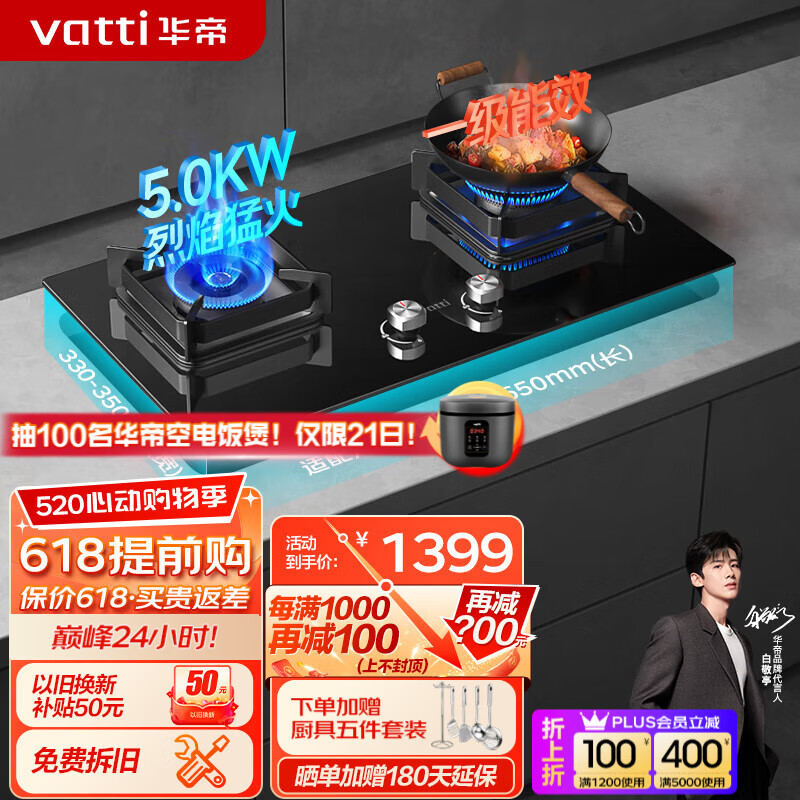 华帝(VATTI)燃气灶嵌入式台式 煤气灶双灶具华帝官方5.0kW猛火灶台 多档火力精控 一级能效 开孔可调节 i10073B-液化气价格:1399.00元!