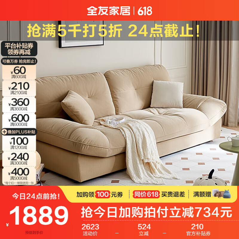 全友家居 简约风布艺沙发小户型客厅猫爪布云朵直排双人沙发111039价格:2623.75元!